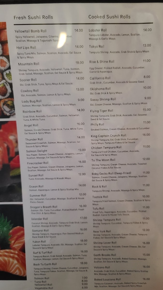 Islander Roll, Lady Bug Roll, Goonie Roll, Rock and Roll, Spicy Yellowtail Roll, Baby Gecko, and Thunder Roll.